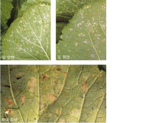 곰팡이병으로 배추에서 가장 흔한 병이다. 주로 잎에 발생하는데 처음에는 회갈색 반점이 생겼다가 점차 원형, 다각형 또는 부정형으로 된다. 보통 묵은 잎에서 새잎으로 퍼지고 심하면 잎전체가 담갈색으로 되어 수확 하기가 어려워 진다.