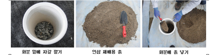 화분에 인삼을 심을 때는 제일 밑에 자갈을 2∼3cm 정도 깔고 그 위에 흙을 넣으면서 인삼을 심는다.