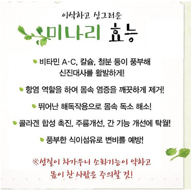 2. 미나리는 알코올 분해과정에서 생기는 혈액 속의 아세트알데히드를 깨끗하게 씻어주어 숙취를 해소하고 간을 보호하는 역할을 한다.