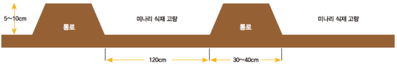 즉, 두둑을 통로(고랑)보다 낮게 만들어야 한다. 여건이 안 될 경우에는 평이랑으로 재배해도 무방하다.