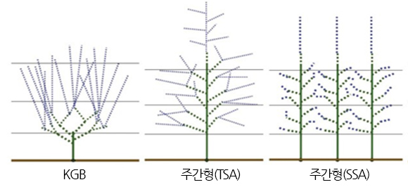 - 일손이 많이 가더라도 밀식재배(베게심기)로 단위면적당 생산성을 높이고자 한다면 주간형(원줄기에서 발생시킨 원가지를 즉시 결과지로 이용하는 수형)이나 케이지비(KGB, Kym Green Bush, 기본적으로 개심형을 응용한 것으로 원줄기를 절단한 후 12~16개의 원가지를 발생시켜 결과지로 이용하는 수형) 등의 나무모양이 적합하다. 이 경우엔 ‘기셀라 5∼6호’와 같은 왜성대목(왜성대목은 유전적으로 키가 작은 성질을 지닌 대목임)이 좋다.