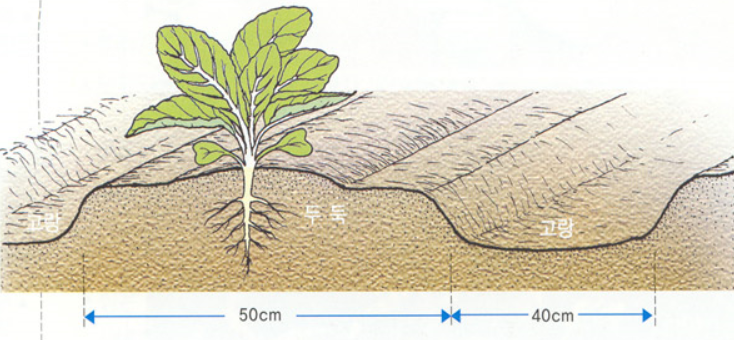 밑거름을 준 다음 흙을 곱게 부수고, 50cm 간격으로 두둑을 만든다