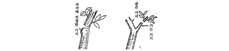 두갈래로 갈라지는 차지(叉枝)중 굵은 가지는 그대로 두고 가는 가지를 분기 점 가까운 곳에서 자르면 자른 부위에서의 발아가 어렵다.