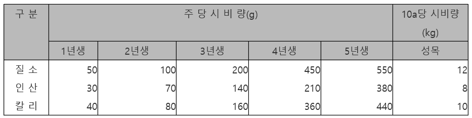 묘목 재식시에는 요소와 염화가리 등을 시비하지 말고, 활착이 완료된 후에 기준량을 시용하도록 한다.