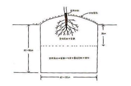 배수가 양호하고 비옥한 모래 참흙에서는 지름 60cm, 깊이 60cm로 하고, 배수는 양호하지만 척박한 모래 참흙에서는 지름 120m, 깊이 80cm로 하며, 배수가 불량한 점질 토양에서는 지름 120cm, 깊이 60cm정도로 구덩이를 파주는 것이 좋다.