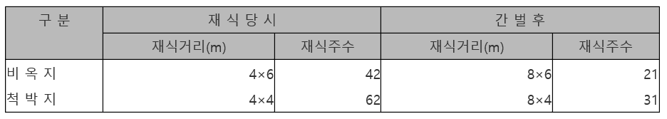 간벌하여 10a당 21주(8mx6m)~31주(8mx4m)가 되게한다.