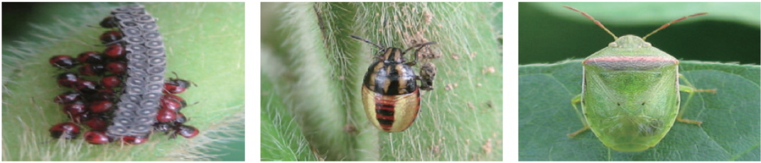 - 노린재류는 꼬투리 및 씨알에 구침을 찔러 즙액을 빨아먹으며 꽃필 때부터 거두기 시기까지 지속적으로 발생함