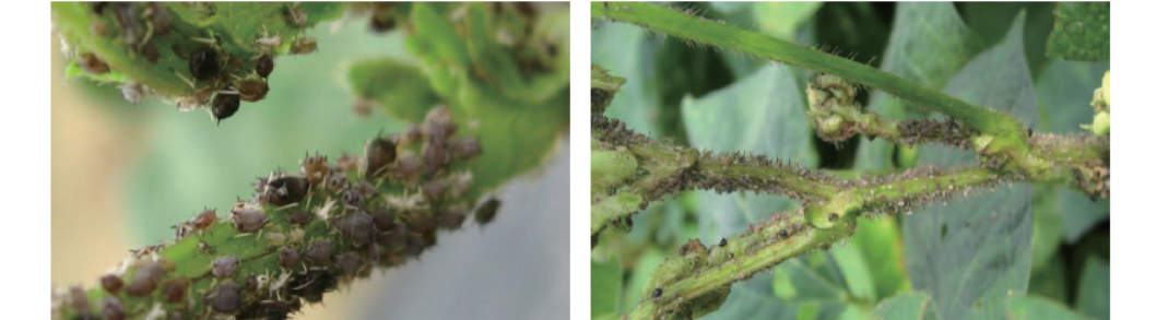 - 진딧물은 어린줄기와 꼬투리에 무리를 이루어 수액을 빨아 먹으며, 작물에 바이러스병을 옮김. 진딧물 배설물에 의한 그을음병이 팥 꼬투리에 발생함