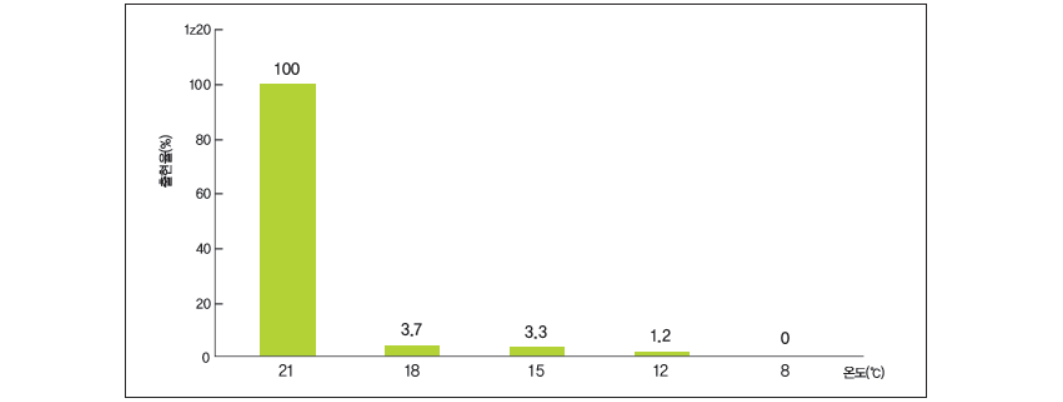 팥 종실의 저장온도에 따른 팥바구미 성충의 발생률