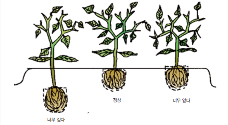 ● 심는 깊이는 육묘 중에 심었던 깊이대로만 심고, 너무 깊이 심거나 얕게 심지 않도록 주의한다.