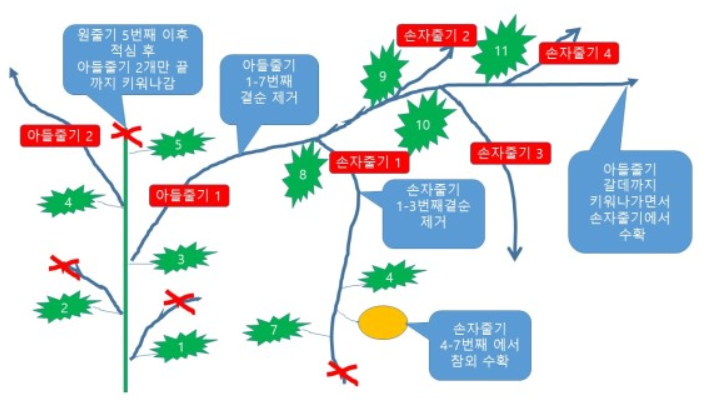 ● 순을 지른 줄기는 곁순이 3~4개 나오는데 생육속도가 비슷한 2개를 골라 키우고 나머지 곁순은 제거한다.