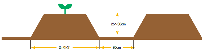 ● 두둑은 넓이는 2m 이상, 높이는 25~30cm로 높게 만든 후 정식할 위치에 35~40cm 간격으로 구멍을 파고 토양 살·선충제를 적량 살포한다.