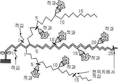※ 7마디 이하의 낮은 마디에서 착과되는 열매는 과실이 작거나 기형과가 되기 쉬우므로 일찍 솎아준다.