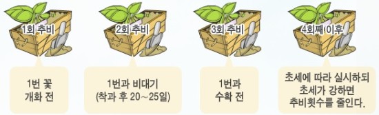 - 추비 : 과실비대와 함께 초세를 유지시키고 생육 후반기까지 줄기와 잎이 쇠약해지지 않도록 추비를 3~4회 시용