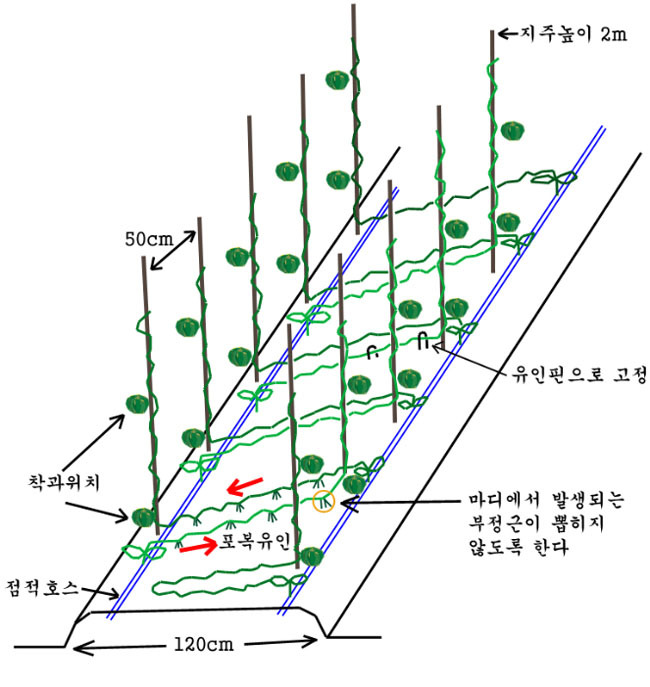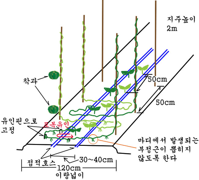 ● 어미줄기를 잘라주고 아들줄기만 2~3줄을 유인하여 재배한다. 그러나, 지력이 나쁘거나 모종에 상처가 있을 때에는 어미줄기 1줄 유인도 좋다.