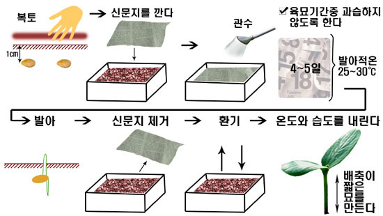 ● 파종상은 일찍 준비하고 파종 후 저온시의 관수는 발아때까지 억제한다. 발아 후의 신문지 제거는 천천히 한다.