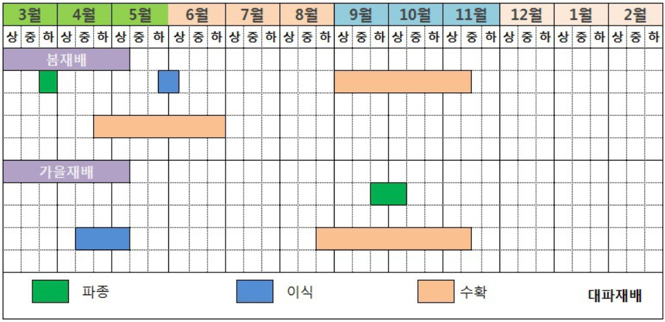 봄파종은 모종 기르는 기간이 비교적 짧으면서 재포기간이 가을재배에 비해 길지는 않으면서 수량도 많다.