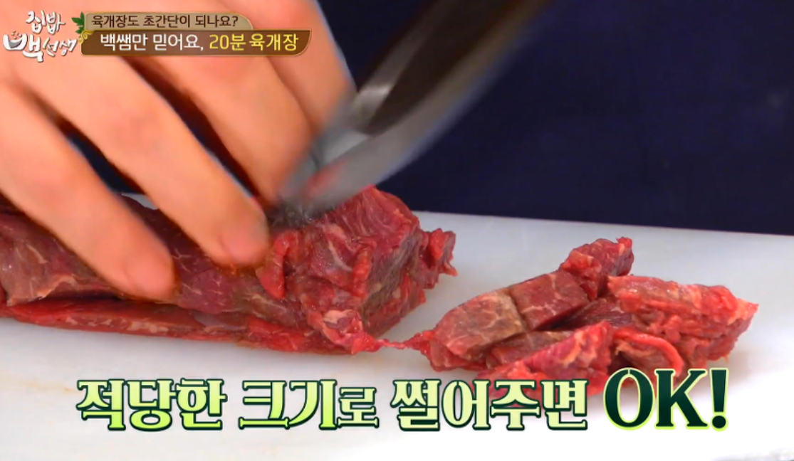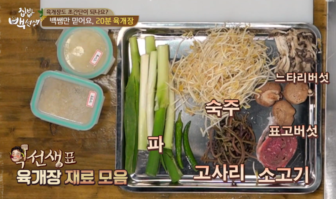 육개장은 깊은 맛을 내기 위하여 조리 시간이 비교적 긴편이다. 집밥 백선생에서는 이 시간을 단축하여 20분만에 간단하게 만들 수 있는 육개장을 선보인 바 있다. 어떻게 이것이 가능할지 궁금하기도 한데 재료와 황금레시피를 알아본다.