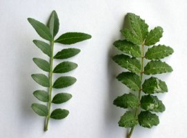 <좌측=산초,우측=초피. 산초 잎은 가장자리가 밋밋하고, 초피는 파도형 이다>