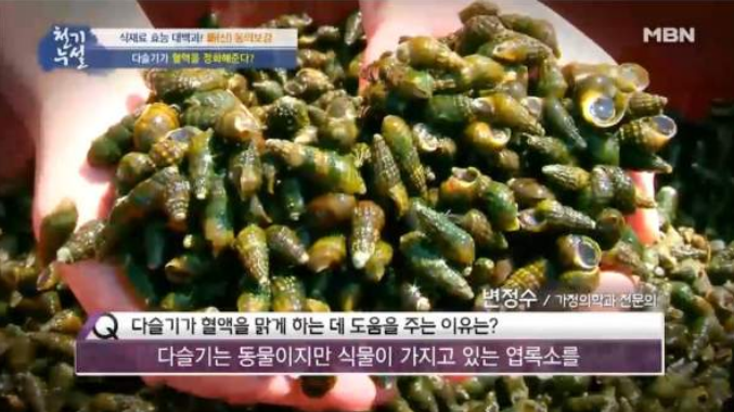 민물 고둥인 다슬기를 삶으면 파란 물이 나오는데 간의 세포조직 원료가 되는 청색소를 공급해 주는 것이 바로 민물 고둥 다슬기이다. 민물 고둥인 다슬기는 간염이나 간경화를 고치는 약으로 민간요법에서 흔히 썼다고 한다.