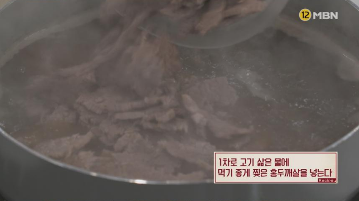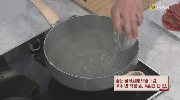 2. 끓는 물 6컵에 맛술 1컵, 후추 반 작은 술, 흑설탕 반 컵, 손질한 홍두깨살을 넣고 5분간 삶는다.