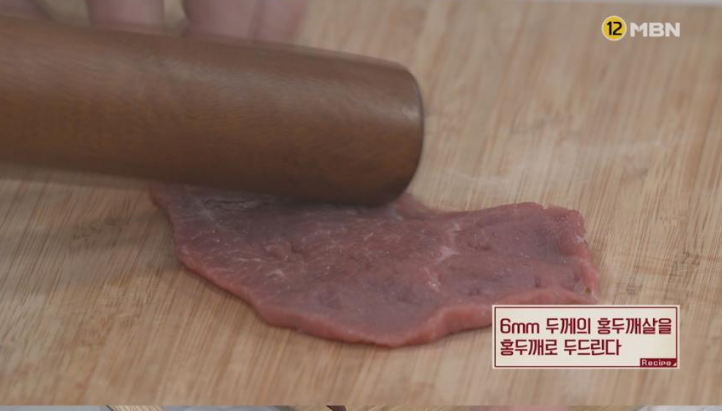 1. 6mm 두께의 홍두깨살을 홍두깨로 두드린다.
