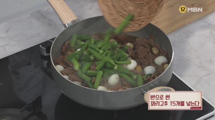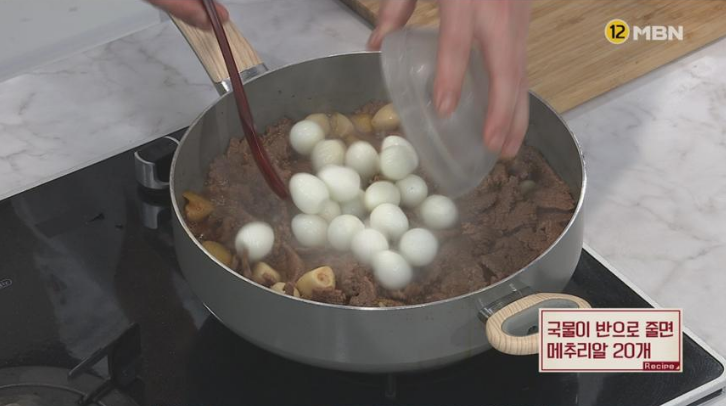 8. 국물이 반으로 줄면 메추리알 20개, 반으로 썬 꽈리고추 15개를 넣는다.