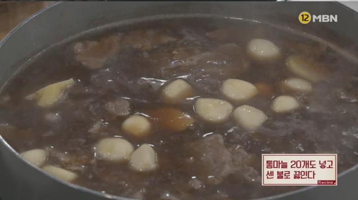 7. 생강 1알을 편으로 썰어 넣는다. 통마늘 20개도 넣고 센 불로 끓인다.