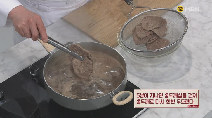 3. 5분이 지나면 홍두깨살을 건져 홍두깨로 다시 한번 두드린다.