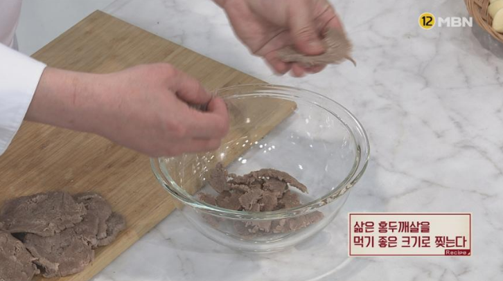 4. 삶은 홍두깨살은 양념이 골고루 밸 수 있도록 결대로 약 4cm 두께로 잘라준다.