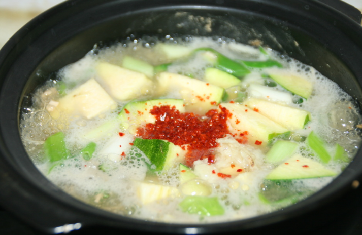 재료: 고기, 무, 쌀뜨물, 된장, 고추장, 다진 마늘, 고추, 파