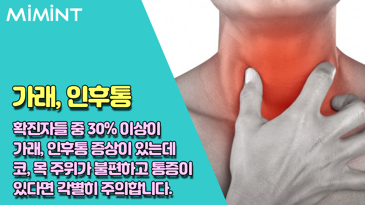 코로나 확진자들 중 30%이상이 가래, 인후통 증상이 있습니다.