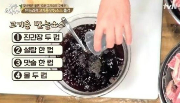▶만능 고기 양념장 재료: 진간장 4컵, 물 4컵, 황설탕 2컵, 황물엿 2컵, 사과 4개, 배 1개, 양파 2개, 통마늘 20개, 생강 4쪽, 레몬 반 개, 다시마 2장, 건 표고버섯 10개, 통후추 2 큰 술, 감초 10개