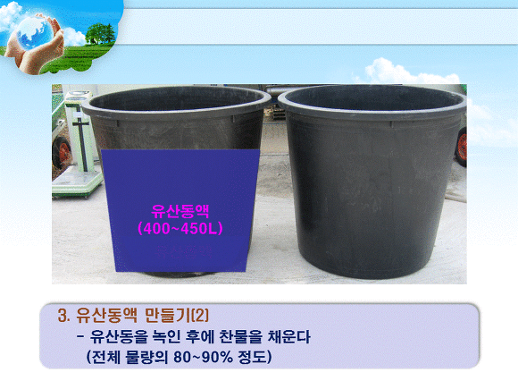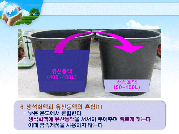 3. 다른 용기에 생석회를 소량의 따듯한 물로 잘 섞은 후(消和, slaking), 물을 첨가 하여 제조하는 총량의 10~20%되게 석회유를 만든다. 사용하는 통이나 저어주는 막대기 등은 반드시 금속제가 아닌 재질 (고무통, 나무통)을 사용한다.
