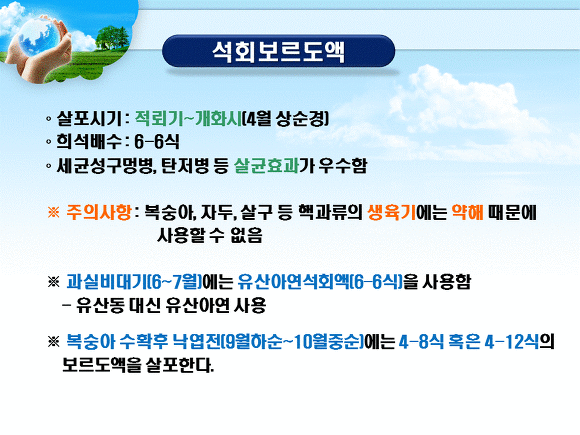 최근 이상고온으로 발아후 꽃피는 기간이 점차 가까와져 유황합제를 적기에 살포했을때 보르도액 살포 시기를 유황합제 살포 10일후로 주기 힘들며 다음 방제와의 간격때문에(복숭아 낙과후 방제는 통상 망건이 벗어지고 수정이 확실히 결정되는 시기에 함.)