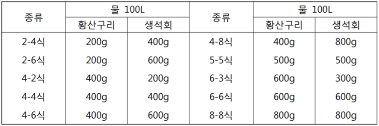 고무다라 150ℓ용 2개, 물 100ℓ, 유산동 600g, 생석회 600g, 전착제 500㏄