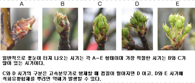 1 살포 시기가 좀 빠른11~12월과 따뜻해져 병원균이나 해충이 활동하기 시작하는 3-4 월무렵에는 효력이 반감되므로 1월 중순부터 2월 하순경이 최적기 이다