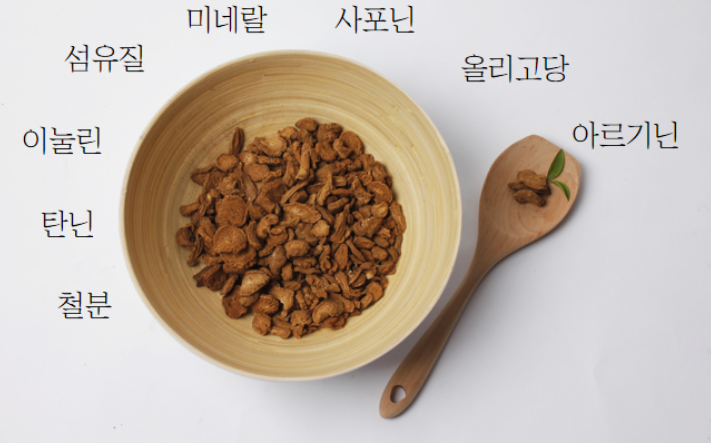 칼륨, 나트륨, 칼슘, 마그네슘 등의 무기질이 나와 우엉의 안토시안 색소와