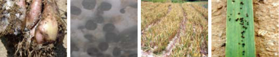● 흑색썩음균핵병 : 지하부의 구근에는 처음 흰 균사가 나타나며, 병이 진전되면서 구근 껍질에 흑색의 균핵이 형성된다.