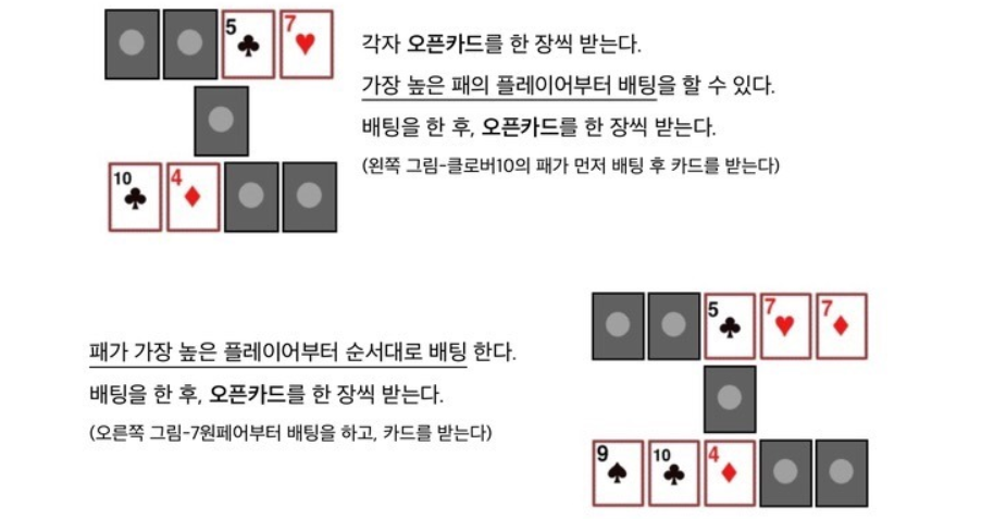 카드를 받기 전에 '시드머니'라고 하여 기본베팅액을 가운데에 놓구요, 모든 플레이어들은 자신의 순서에 원하는 베팅을 할 수 있습니다.