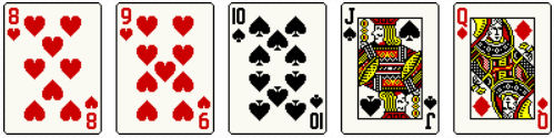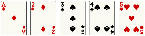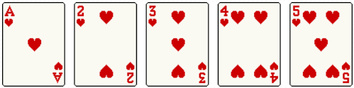 5장이 무늬에 관계없이 연속인 경우, A-K-Q-J-10을 마운틴이라고 하며, A-5-4-3-2는 백스트레이트라고 합니다.