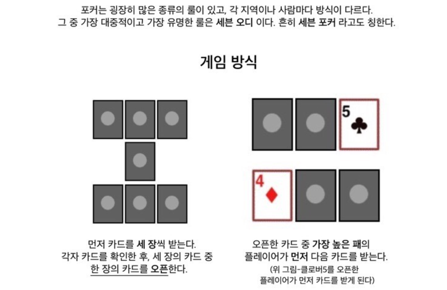 포커 게임 하는방법은 딜러가 자신의 왼쪽부터 시계방향으로 카드를 순서대로 나눠줍니다.
