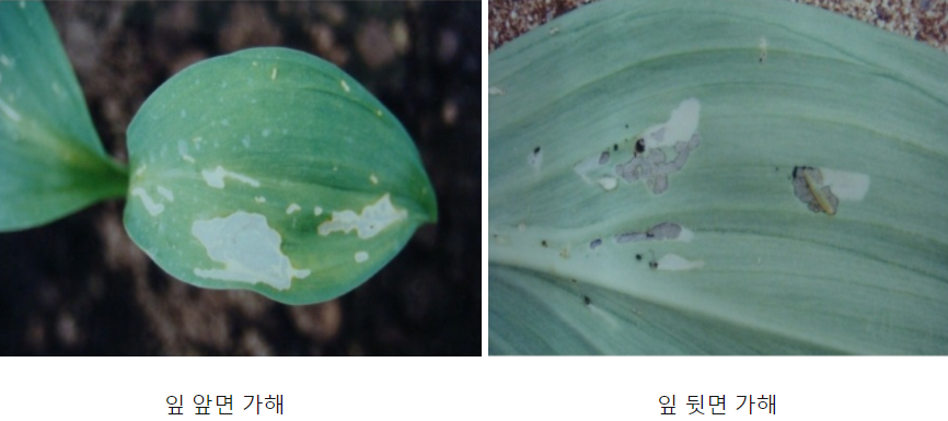 잎에 불규칙한 짧은 흰줄 또는 희거나 누런 반점부위가 생기며, 유충이 겉 표피만을 남기고 엽육을 식해한다.