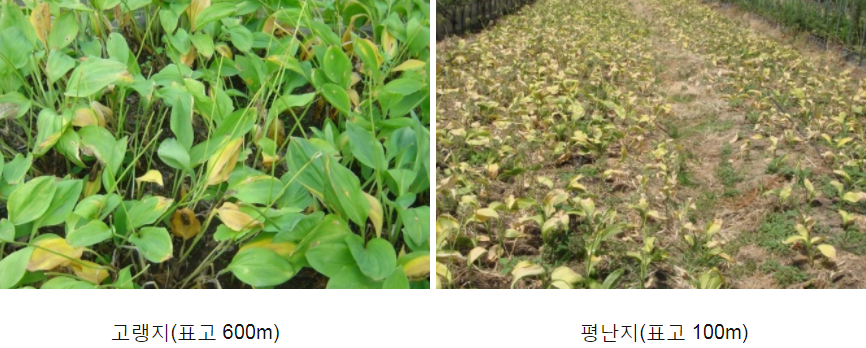 따라서 초가을까지 잎이 고사되지 않고 푸른 상태를 유지할 수 있는 표고 600m 이상의 지역이 재배적지라고 할 수 있다.