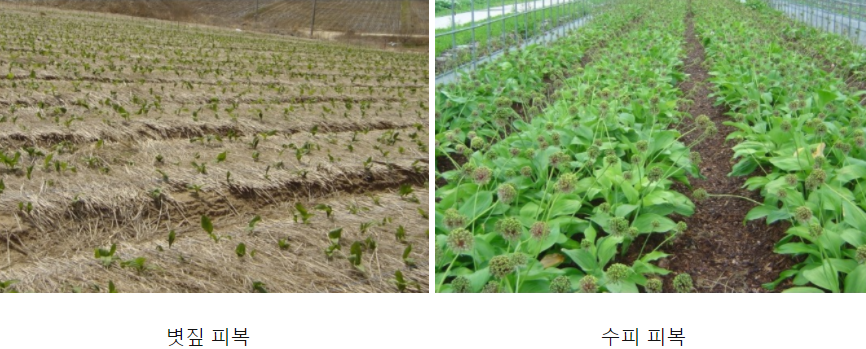 즉, 낙엽이나 볏짚을 3~5cm정도 피복해 줌으로써 고온기에는 온도 상승을 막아 건전한 뿌리발달을 도모한다.
