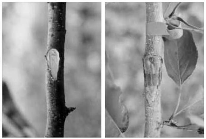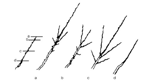 ○ 주간 연장선으로의 수액 이동을 방해하거나, 바꾸어 준다. 전정을 할 때, 강한 직립지 대신에 2~3번째의 약한 가지를 주간 연장지로 대체하여 준다. 이것이 반복되면, 주간 연장부가 지그재그 형태로 되며, 수액의 이동이 어느 정도 억제된다.