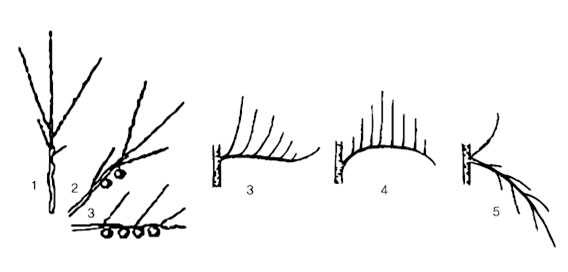 지상 60㎝ 이하에 발생한 가지는 제거하고 위쪽에 발생한 가지는 극단적으로(주간의 1/2 이상) 굵지 않은 한 남겨서 곁가지수를 확보한다. 적당한 높이에 좋은 측지가 많이 발생하여 있으나 주간 선단의 길이가 30㎝ 이하로 약하고 수고가 1.8m 이하일 경우 선단부를 절단(1/3지점)하여 다시 키운다. 선단부가 30~60㎝ 이상이면 절단할 필요가 없으며 선단이 1m 정도로 잘 자라 있으면, 주간 연장 부분을 수평으로 유인하였다가 유인한 부분에서 새가지가 발생하여 10㎝ 정도 될 때 다시 바로 세워준다.